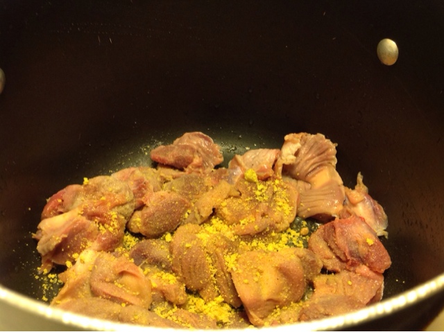 Heat up 1/2 cooking spoon of vegetable oil. Fry the chili powder, stock cube, garlic powder, curry, thyme and salt to bring out the flavor. |